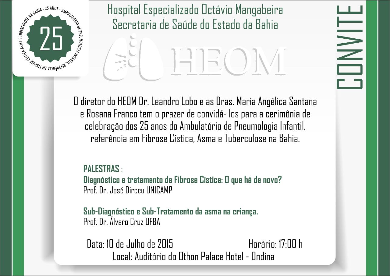 Os 25 anos de atendimento do Ambulatório de Pneumologia Infantil, referência em Fibrose Cística, Asma e Tuberculose do Hospital Especializado Octávio Mangabeira (HEOM), serão celebrados nesta sexta-feira (10), às 17h, no auditório do Othon Palace Hotel, em Ondina, durante a realização do XVI Congresso Norte-Nordeste de Pneumologia e Tisiologia e do X Fórum Norte-Nordeste e Centro Oeste de DPOC (Doença Pulmonar Obstrutiva Crônica).