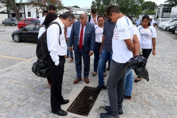 Após o evento no auditório, o secretário Fábio Vilas-Boas, juntamente com Luis Breda, estudantes, professores e colaboradores, fez uma visita no pátio da unidade para orientação de como identificar potenciais focos do mosquito.