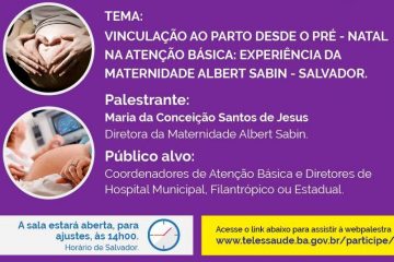 A Secretaria da Saúde do Estado (Sesab) promove amanhã (31), a partir de 14h30min, Webpalestra sobre o tema “Vinculação ao parto desde o pré-natal na Atenção Básica”, com apresentação da experiência da Maternidade Albert Sabin, pela diretora da unidade, Maria da Conceição Santos de Jesus.