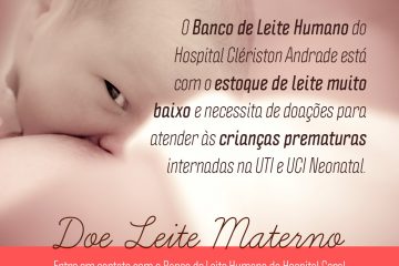 Após o período dos festejos juninos o estoque do Banco de Leite Humano do Hospital Geral Clériston Andrade (BLH/HGCA), em Feira de Santana, está bem abaixo do necessário e precisa ser restabelecido. Diante disso, a coordenação do Centro de Incentivo ao Aleitamento Materno (Ciama/BLH) do HGCA realiza a partir desta segunda-feira (04/07) uma campanha de doação de leite materno e frascos de vidro com tampa plástica (tipo maionese).