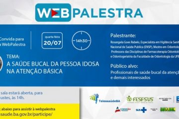 A webpalestra é voltada para os profissionais das Equipes de Saúde Bucal da Atenção Básica e demais interessados. Ressalta-se que a sala estará aberta, para ajustes, a partir das 14 horas, através do link: www.telessaude.ba.gov.br/participe/.
