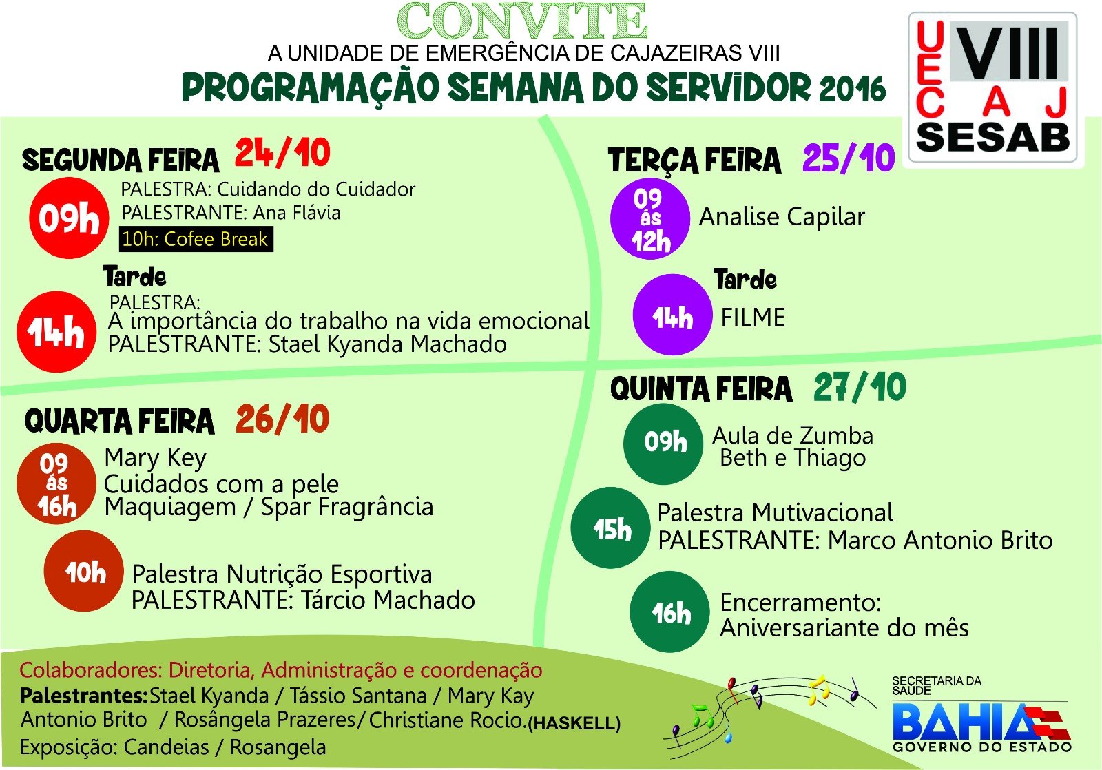 As comemorações do Dia do Servidor Público (28), na Unidade de Emergência de Cajazeira VIII, começam mais cedo, na próxima segunda-feira (24) e seguem até quinta-feira (27) . A programação ocorrerá durante toda a semana e inclui palestras, cuidados com a saúde, exibição de filme, aulas de zumba, encerrando com homenagens aos aniversariantes do mês.