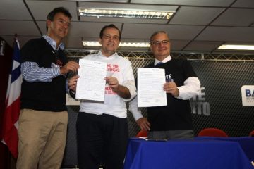 Durante o lançamento da nova campanha estadual de combate ao mosquito Aedes, que aconteceu hoje (15), os secretários estaduais da Saúde e Educação, Fábio Vilas-Boas e Walter Pinheiro, assinaram a adesão ao novo Programa Saúde na Escola, que destina recursos federais para as escolas públicas de qualquer esfera administrativa (municipal, estadual ou federal).