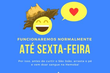 No sábado (24), feriado de São João, todas as unidades da Hemoba estarão fechadas. O funcionamento volta ao normal, em seus horários habituais, na próxima segunda-feira (26). Para obter mais informações sobre os endereços e contatos das unidades, clique aqui.