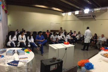 Representantes da Coordenação do programa de resíduos sólidos e da Comissão de Controle de Infecção Hospitalar (CCIH) falaram sobre o funcionamento do hospital e seus processos de trabalho. A infectologista Betânia Nogueira palestrou sobre o papel do residente no controle de infecção hospitalar.