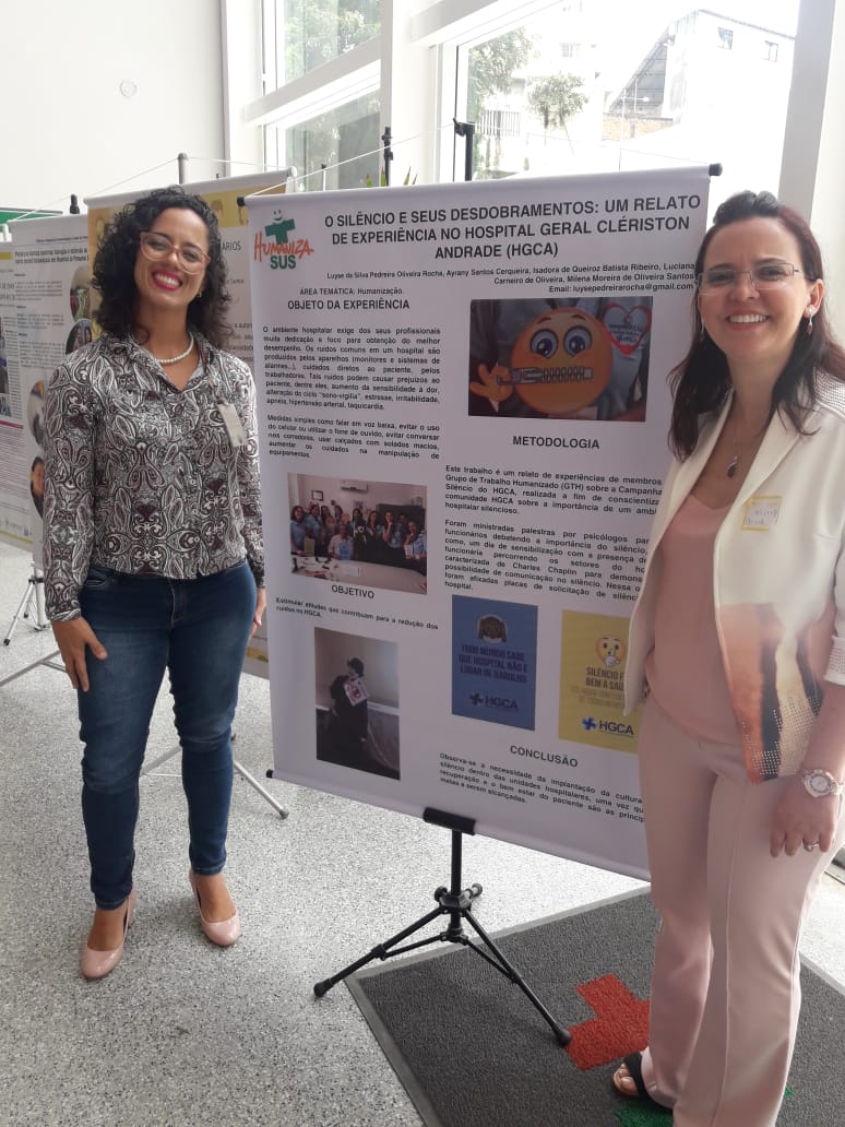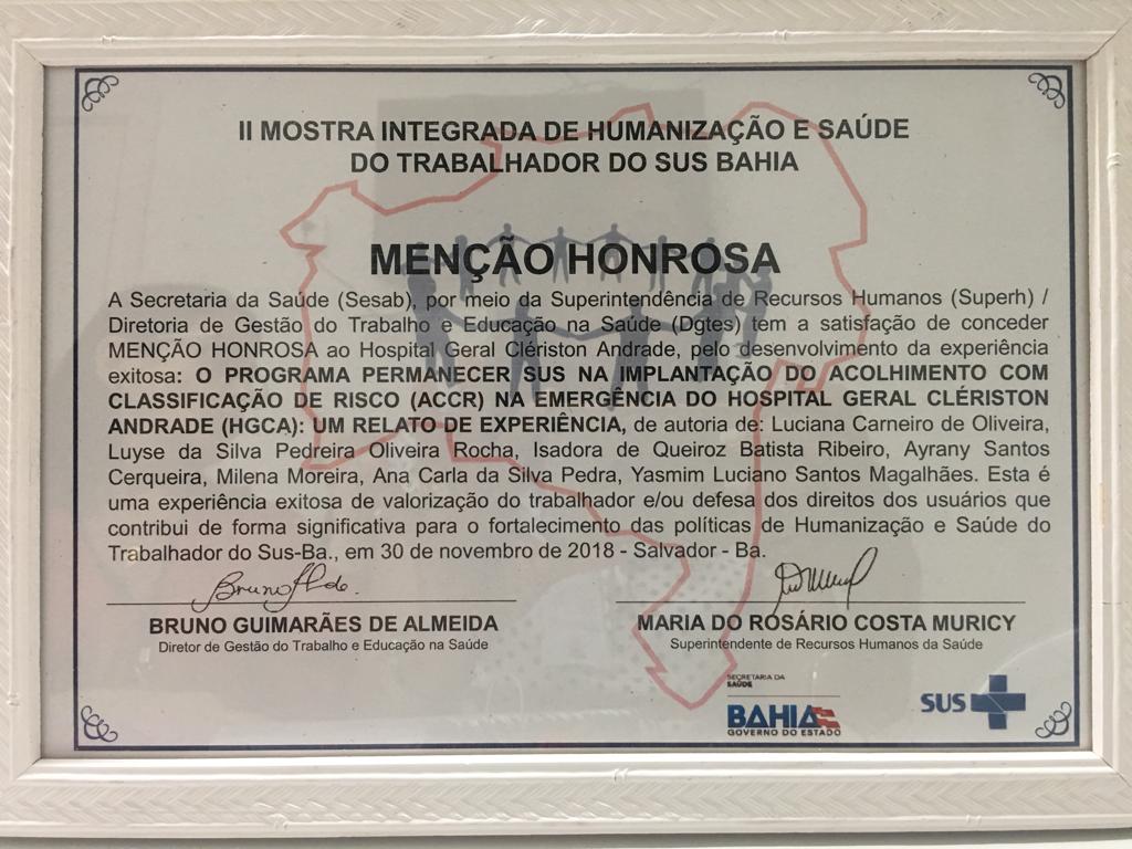 Este ano, a II Mostra Integrada de Humanização e Saúde do Trabalhador do SUS Bahia destacou também em 2018 as categorias: Valorização do trabalhador; Direito dos usuários e Articulação entre Humanização e Saúde do Trabalhador. O GTH teve dois trabalhos inscritos e selecionados: Campanha do Silêncio, que foi apresentado através de pôster, e o Programa Permanecer SUS na Implantação do Acolhimento com Classificação de Risco (ACCR), na emergência do HGCA, com apresentação oral. Este último recebeu Menção Honrosa da Secretaria da Saúde (Sesab), através da DGTES.