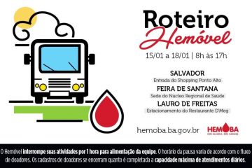 Em busca de estar mais perto dos doadores, a Fundação Hemoba estará de terça (15) a sexta-feira (18) em três pontos extras das 8h às 17h. Em Salvador, o Hemóvel irá atender na entrada do Shopping Ponto Alto; no  município de Feira de Santana, o atendimento será realizado na sede do Núcleo Regional de Saúde e em Lauro de Freitas, a unidade vai ficar no estacionamento do Restaurante D’Meg. Neste mês, com uma baixa de aproximadamente 20% nas doações, o banco de sangue da Hemoba está operando com a classificação de crítica e alerta, com uma redução mais acentuada entre os tipos sanguíneos de Rh negativo.