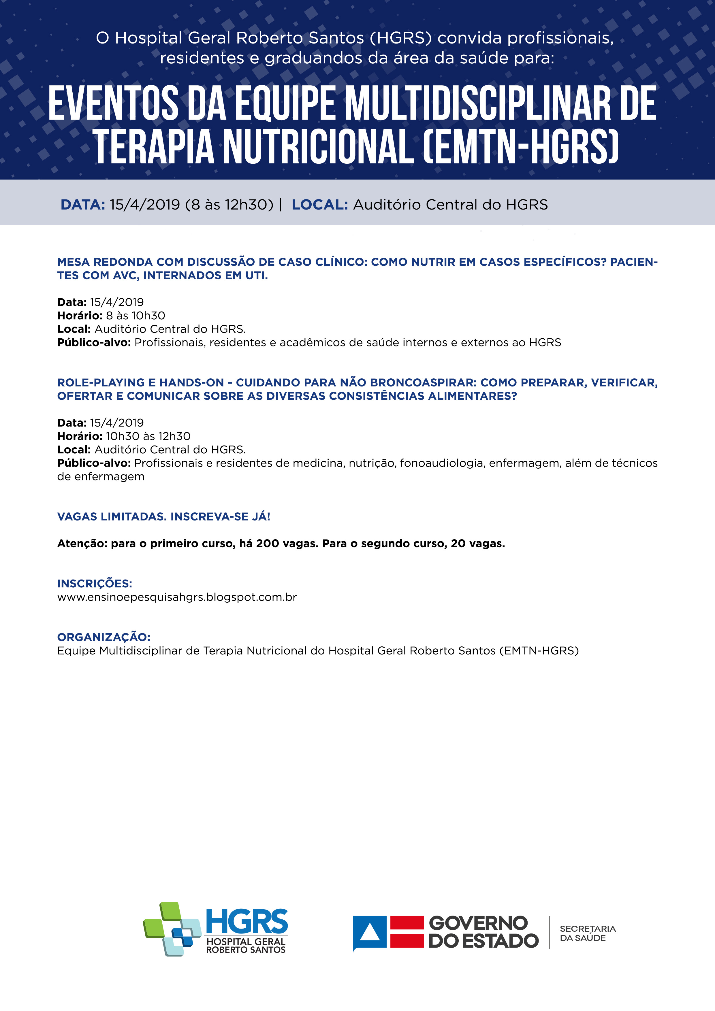 A Equipe Multidisciplinar de Terapia Nutricional do Hospital Geral Roberto Santos (EMTN-HGRS) promoverá, no próximo dia 15, dois eventos. Trata-se da mesa-redonda ‘Como nutrir em casos específicos? Pacientes com acidente vascular cerebral (AVC), internados em unidade de terapia itensiva (UTI)’ e, ainda, o role-playing e hands-on ‘Cuidando para não broncoaspirar: como preparar, verificar, ofertar e comunicar sobre as diversas consistências alimentares?’.