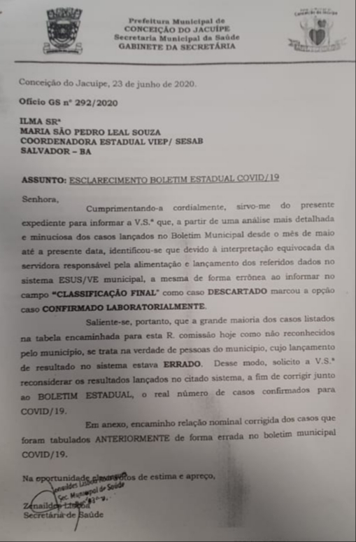 O boletim epidemiológico contabiliza 56.422 casos confirmados, 152.795 casos descartados e 73.512 em investigação. Estes dados representam notificações oficiais compiladas pelo Centro de Informações Estratégicas em Vigilância em Saúde da Bahia (Cievs-BA), em conjunto com os Cievs municipais e as bases de dados do Ministério da Saúde até as 17 horas desta sexta-feira (26). Cabe ressaltar que o município de Conceição do Jacuípe enviou um ofício a Secretaria da Saúde do Estado da Bahia comunicando que errou no preenchimento dos dados no sistema de notificação e lançou casos negativos como sendo positivos. Em virtude deste comunicado, no qual o município reconhece a falha no preenchimento, 53 casos serão excluídos. Para acessar o ofício, clique aqui.