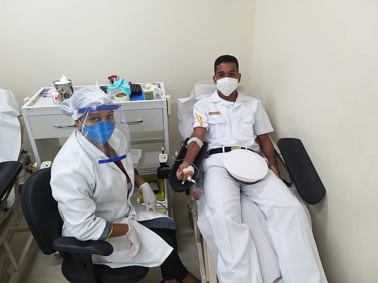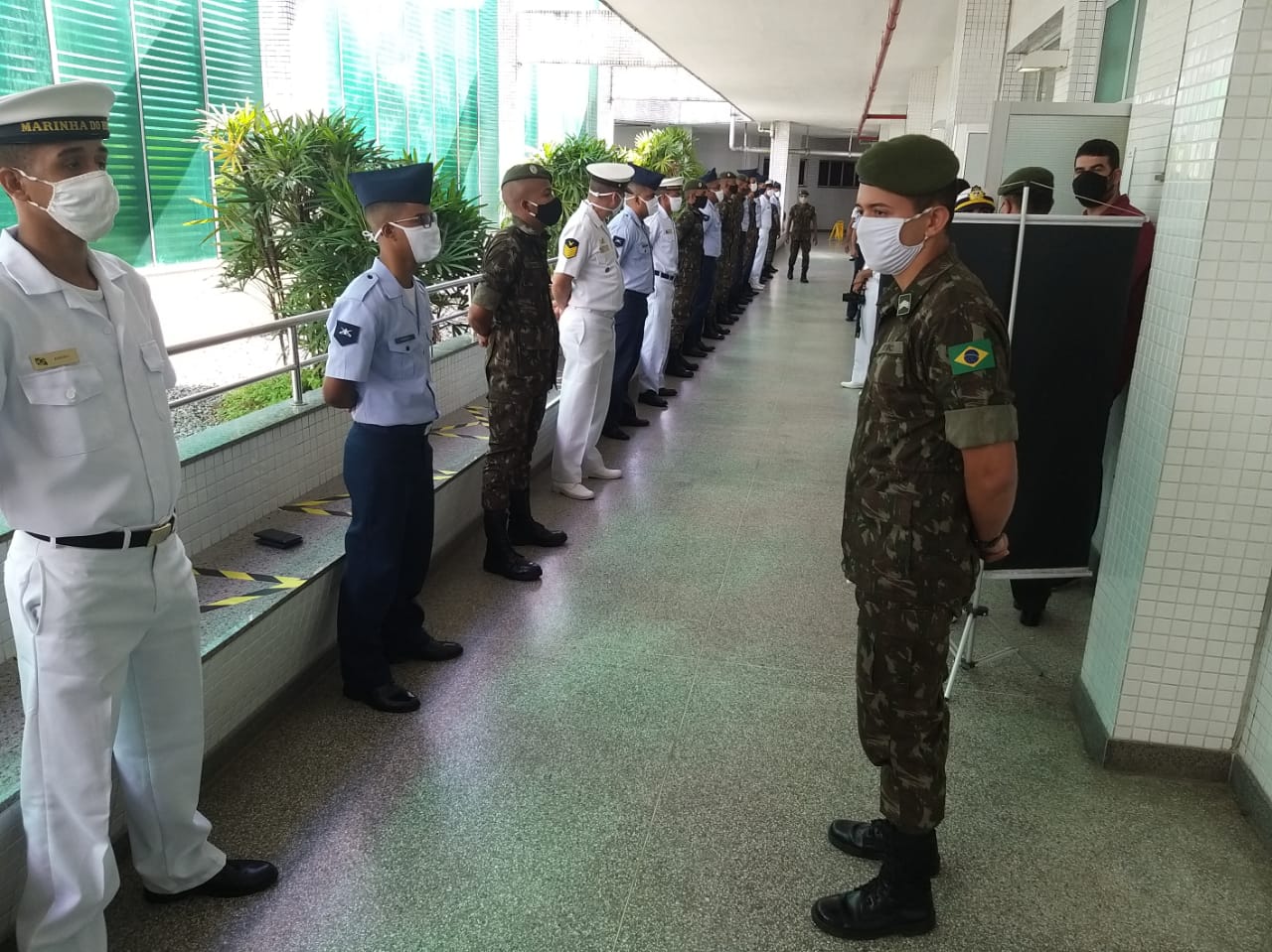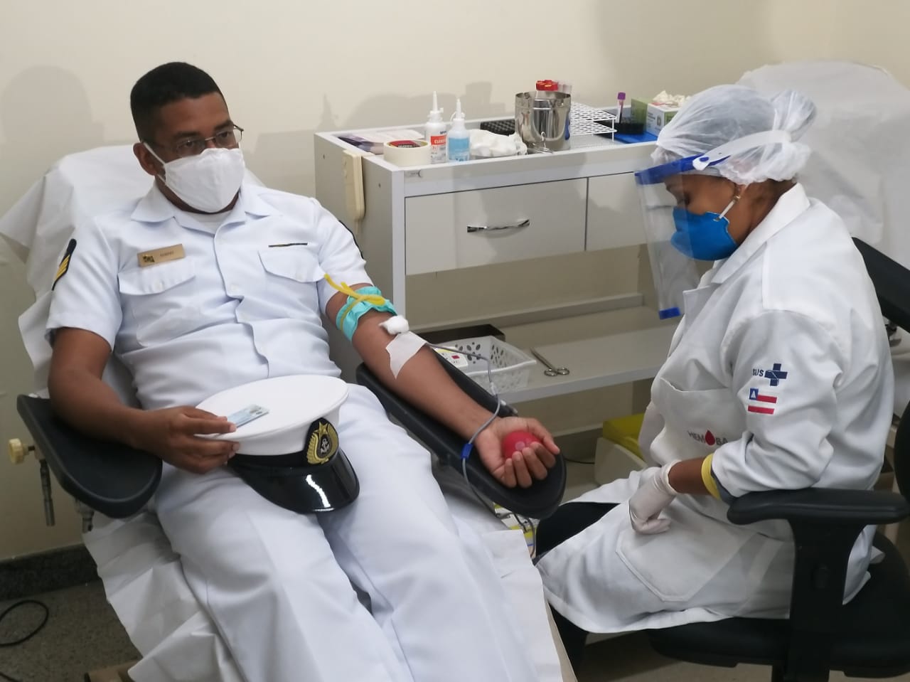 Vinte militares do Comando Conjunto Bahia, formado pela Marinha do Brasil, Exército Brasileiro e Força Aérea Brasileira, estiveram no Hospital do Subúrbio (HS), nesta quinta-feira, 23 de julho, participando de uma ação de doação de sangue. A coleta foi realizada na unidade da Fundação de Hematologia e Hemoterapia da Bahia (Hemoba) localizada no HS. A iniciativa teve como objetivo contribuir para a normalização dos estoques de bolsas de sangue, os quais estão em nível crítico devido à pandemia de COVID-19.