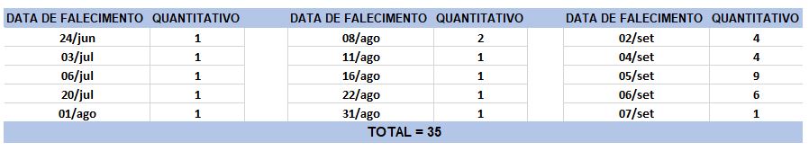 O boletim epidemiológico de hoje contabiliza 35 óbitos que ocorreram em diversas datas, conforme tabela abaixo. A existência de registros tardios e/ou acúmulo de casos deve-se a sobrecarga das equipes de investigação, pois há doenças de notificação compulsória para além da Covid-19. Outro motivo é o aprofundamento das investigações epidemiológicas por parte das vigilâncias municipais e estadual a fim de evitar distorções ou equívocos, como desconsiderar a causa do óbito um traumatismo craniano ou um câncer em estágio terminal, ainda que a pessoa esteja infectada pelo coronavírus.