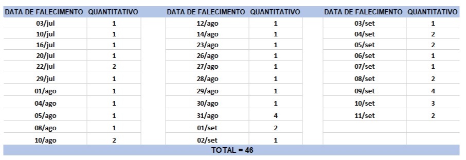 O boletim epidemiológico de hoje contabiliza 46 óbitos que ocorreram em diversas datas, conforme tabela abaixo. A existência de registros tardios e/ou acúmulo de casos deve-se a sobrecarga das equipes de investigação, pois há doenças de notificação compulsória para além da Covid-19. Outro motivo é o aprofundamento das investigações epidemiológicas por parte das vigilâncias municipais e estadual a fim de evitar distorções ou equívocos, como desconsiderar a causa do óbito um traumatismo craniano ou um câncer em estágio terminal, ainda que a pessoa esteja infectada pelo coronavírus.