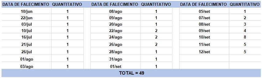 O boletim epidemiológico de hoje contabiliza 49 óbitos que ocorreram em diversas datas, conforme tabela abaixo. A existência de registros tardios e/ou acúmulo de casos deve-se a sobrecarga das equipes de investigação, pois há doenças de notificação compulsória para além da Covid-19. Outro motivo é o aprofundamento das investigações epidemiológicas por parte das vigilâncias municipais e estadual a fim de evitar distorções ou equívocos, como desconsiderar a causa do óbito um traumatismo craniano ou um câncer em estágio terminal, ainda que a pessoa esteja infectada pelo coronavírus.