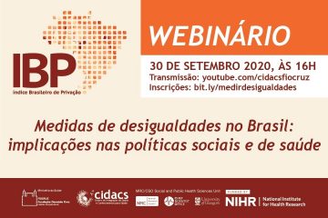 Estão abertas as inscrições para o webinário “Medidas de desigualdades no Brasil: implicações nas políticas sociais e de saúde”, promovido pelo Cidacs/Fiocruz Bahia. O evento, que ocorre no dia 30 de setembro, às 16h, discute as características e formulações das medidas de desigualdades no Brasil. As inscrições podem ser feitas neste link https://bit.ly/medirdesigualdades.