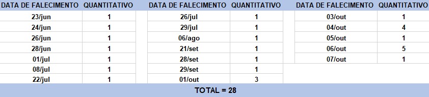 O boletim epidemiológico de hoje contabiliza 28 óbitos que ocorreram em diversas datas, conforme tabela abaixo. A existência de registros tardios e/ou acúmulo de casos deve-se a sobrecarga das equipes de investigação, pois há doenças de notificação compulsória para além da Covid-19. Outro motivo é o aprofundamento das investigações epidemiológicas por parte das vigilâncias municipais e estadual a fim de evitar distorções ou equívocos, como desconsiderar a causa do óbito um traumatismo craniano ou um câncer em estágio terminal, ainda que a pessoa esteja infectada pelo coronavírus.
