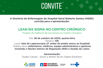 O Hospital Geral Roberto Santos (HGRS) iniciará o processo de melhoria do centro cirúrgico da unidade, utilizando a metodologia Lean Six Sigma. O primeiro encontro será realizado no dia 28 de outubro, às 10h, no Centro de Treinamento em Laparoscopia, situado no 2º andar do prédio anexo.