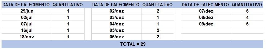 O boletim epidemiológico de hoje contabiliza 29 óbitos que ocorreram em diversas datas, conforme tabela abaixo. A existência de registros tardios e/ou acúmulo de casos deve-se a sobrecarga das equipes de investigação, pois há doenças de notificação compulsória para além da Covid-19. Outro motivo é o aprofundamento das investigações epidemiológicas por parte das vigilâncias municipais e estadual a fim de evitar distorções ou equívocos, como desconsiderar a causa do óbito um traumatismo craniano ou um câncer em estágio terminal, ainda que a pessoa esteja infectada pelo coronavírus.