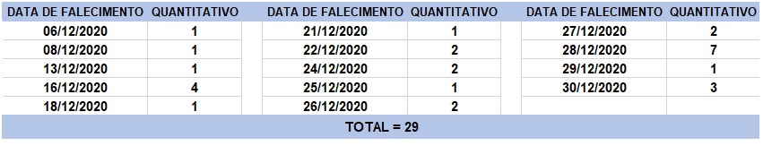 O boletim epidemiológico de hoje contabiliza 29 óbitos que ocorreram em diversas datas, conforme tabela abaixo. A existência de registros tardios e/ou acúmulo de casos deve-se a sobrecarga das equipes de investigação, pois há doenças de notificação compulsória para além da Covid-19. Outro motivo é o aprofundamento das investigações epidemiológicas por parte das vigilâncias municipais e estadual a fim de evitar distorções ou equívocos, como desconsiderar a causa do óbito um traumatismo craniano ou um câncer em estágio terminal, ainda que a pessoa esteja infectada pelo coronavírus.