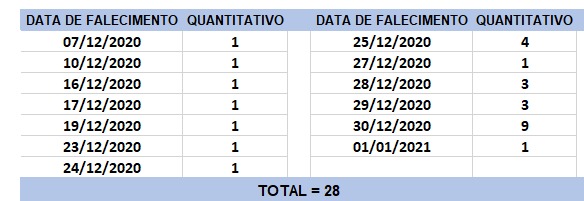 O boletim epidemiológico de hoje contabiliza 28 óbitos que ocorreram em diversas datas, conforme tabela abaixo. A existência de registros tardios e/ou acúmulo de casos deve-se a sobrecarga das equipes de investigação, pois há doenças de notificação compulsória para além da Covid-19. Outro motivo é o aprofundamento das investigações epidemiológicas por parte das vigilâncias municipais e estadual a fim de evitar distorções ou equívocos, como desconsiderar a causa do óbito um traumatismo craniano ou um câncer em estágio terminal, ainda que a pessoa esteja infectada pelo coronavírus.