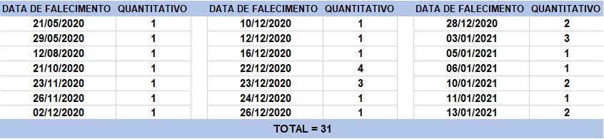 O boletim epidemiológico de hoje contabiliza 31 óbitos que ocorreram em diversas datas, conforme tabela abaixo.