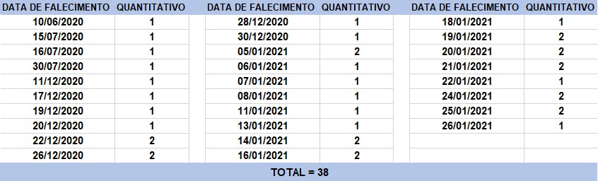 O boletim epidemiológico de hoje contabiliza 38 óbitos que ocorreram em diversas datas, conforme tabela abaixo.