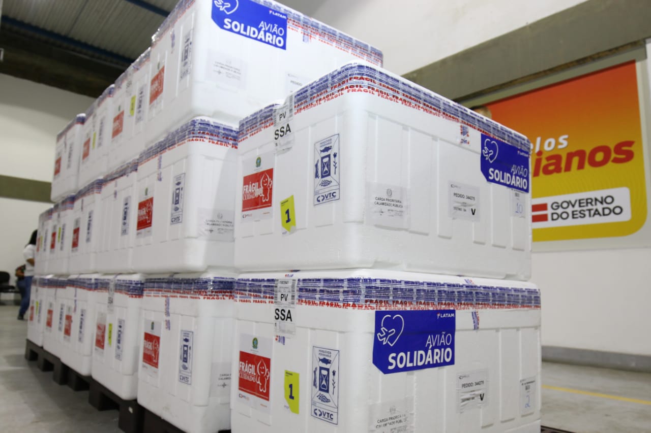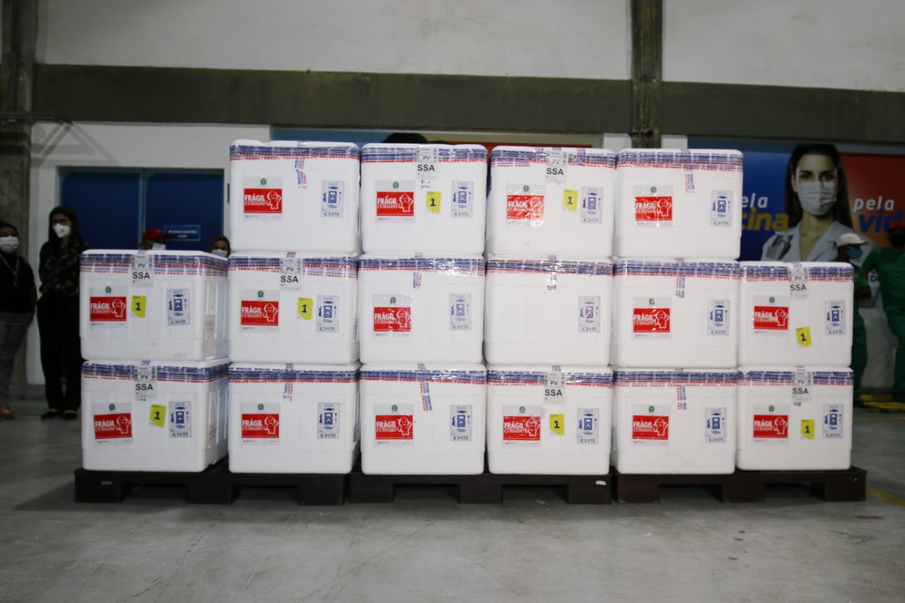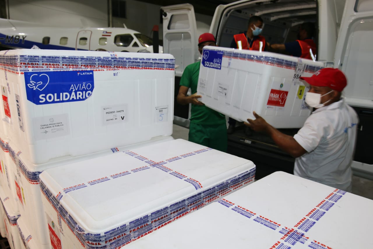 Uma nova remessa de vacinas contra a Covid-19 chegou à Bahia na noite desta terça-feira (9). Trazidas em um vôo comercial que pousou no aeroporto de Salvador às 23h10, as 178.600 doses do imunizante produzido pelo Butantan começarão a ser distribuídas para o interior do estado na manhã desta quarta-feira (10). Este é a sétimo envio que chega ao estado. Com esta carga, a Bahia totaliza 1.289.800 doses recebidas, entre Coronavac e Oxford, desde o dia 18 de janeiro, quando chegou a primeira remessa.