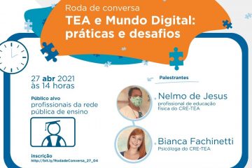 Participarão do encontro a psicóloga Bianca Fachinetti e o profissional de educação física Nelmo de Jesus, ambos do CRE-TEA. A inscrição é gratuita e pode ser feita pelo link: http://bit.ly/RodadeConversa_27_04. De acordo com os palestrantes, é importante destacar que pessoas com TEA não constituem um público homogêneo. Há gradações do espectro autista, o que torna cada individuo único. “Mas os atuais estudos sobre o uso das tecnologias digitais para o ensino de pessoas autistas demonstram o grande interesse e intimidade dessas pessoas com as ferramentas digitais”, ressalta Bianca.