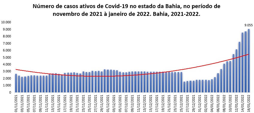 A Bahia registrou neste domingo (16) 9.055 casos ativos de Covid-19. A última vez que o estado teve um número de ativos maior ao de hoje foi em 23/07/21, quando foram registrados 9.301 ocorrências. O boletim epidemiológico aponta ainda que, nas últimas 24 horas, foram computados 1.472 casos de Covid-19 (taxa de crescimento de +0,11%), 1.145 recuperados (+0,09%) e 4 óbitos. Dos 1.288.556 casos confirmados desde o início da pandemia, 1.251.839 já são considerados recuperados e 27.662 tiveram óbito confirmado.