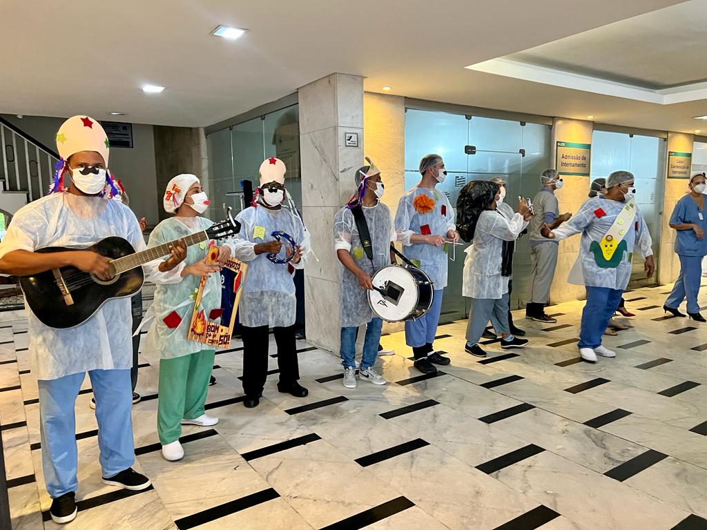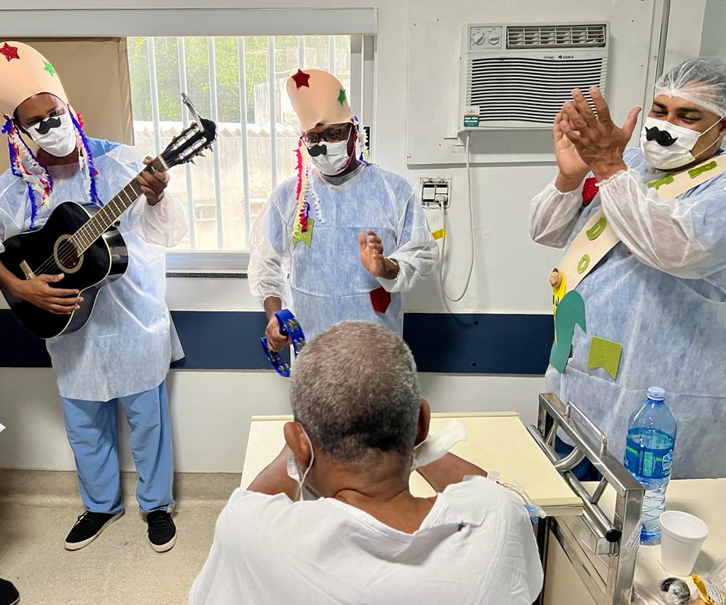 Na UTI 6, o grupo ficou na parte de fora, no corredor, onde até improvisou uma quadrilha. E uma das enfermeiras da unidade, externou surpreendida: “Me pegaram de surpresa! A equipe de musicoterapia veio alegrar o nosso plantão. Ainda não estamos livre da Covid, mas, como bons baianos, estamos retomando com precaução os festejos juninos. Agradeço ao INTS por este momento de alegria e descontração no nosso ambiente de trabalho!”