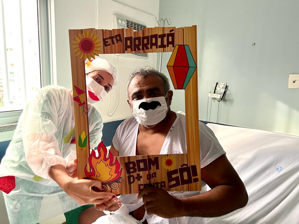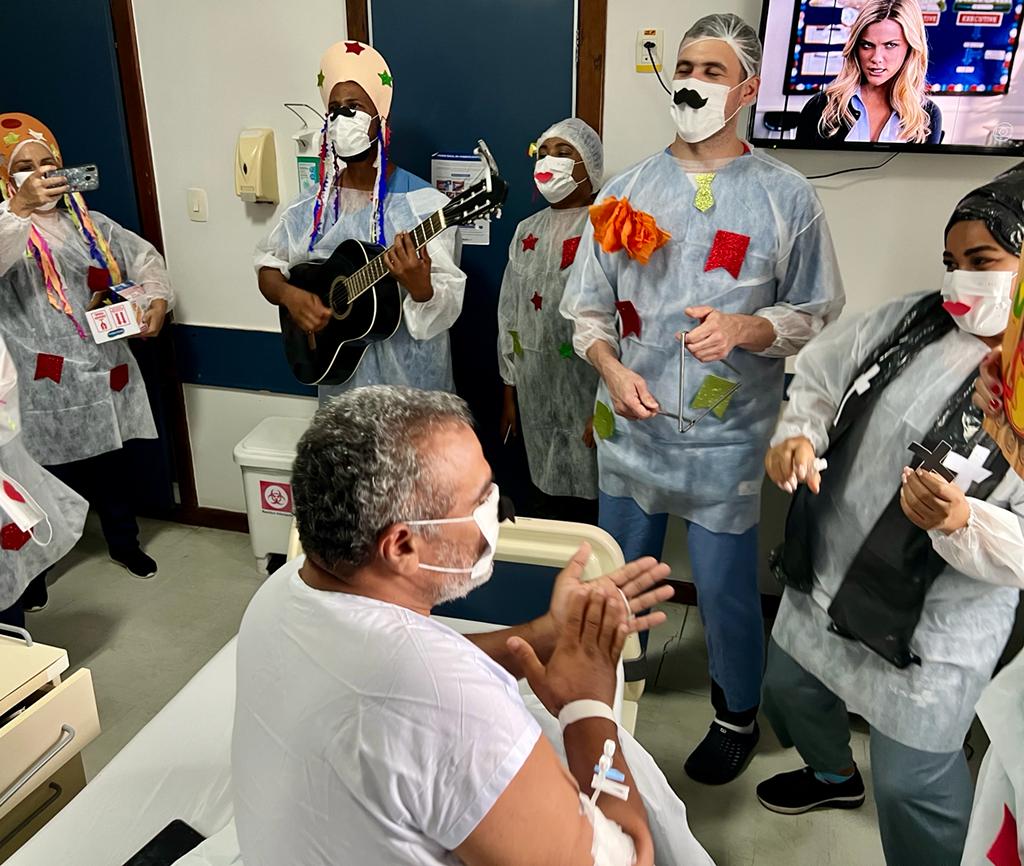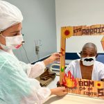 E foi exatamente desta forma que sentiu o comerciante Vitalmiro Cardoso do Rosário, 52 anos, internado no HE desde o dia de Santo Antônio, 13 de junho, ao receber um forró de São João no seu leito 611 da Enfermaria 6C: “Por alguns instantes eu me senti fora daqui! O pessoal é bom, prestativo, me trata muito bem… mas este forró me deixou emocionado!” Ele que mora em Camaçari/BA, região onde tem muitas festas juninas.