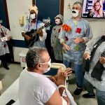 Cerca de 20 profissionais da Unidade, de diferentes especialidades, caracterizados com adereços juninos, acompanham a banda “Música Une” – formada também por profissionais do HE – que é coordenada pelo musicoterapeuta Marcos Barbosa, visitando leitos e setores do Hospital. A música se tornou um marco de humanização no maior, e hoje único, Centro de Tratamento Covid da Bahia. Desde maio de 2020, quando o hospital foi reaberto, a musicoterapia é praticada no HE para pacientes e colaboradores.