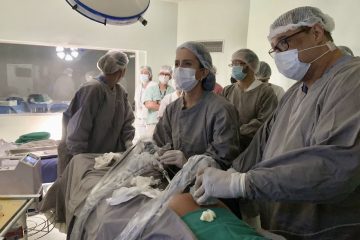 A gestante Aline Muniz, 28 anos, natural de Uruçuca, no Sul do Estado, foi diagnóstica com um episódio raro que acontece na gestação gemelar, em que um dos fetos recebe mais sangue e suprimentos da paciente do que o outro, comprometendo seu desenvolvimento e podendo levá-lo à morte, como explicou o médico Maurício Saito, especialista em cirurgia fetal, que veio de São Paulo para compor a equipe do HGRS que realizou o bloqueio placentário na paciente.