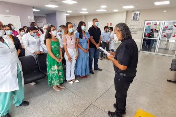 Um dos momentos mais emocionantes da solenidade de hoje aconteceu durante a visita-guiada do padre às instalações do hospital, na porta da UTI Neonatal. Ao saber da presença do religioso, a equipe foi recepciona-lo e pediu uma oração especial para um recém-nascido de 11 dias. “Esse gesto aqui mostra a importância do tema escolhido por vocês para o dia de hoje. O de que além de cuidar das pessoas é preciso estar cuidando também de vocês. Por que só assim vocês poderão prestar um serviço de excelência”, pontuou.