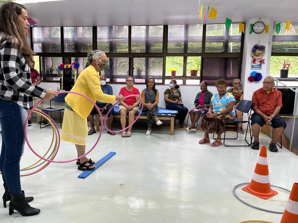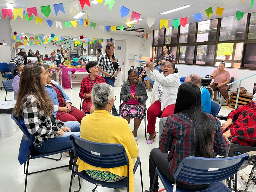 Teve barraca do abraço, jogos, brincadeiras e muita diversão! Mas, também teve informação e orientação. Durante os festejos, a equipe técnica abordou vários aspectos importantes para que as pessoas idosas possam participar dos eventos juninos com segurança. Ressaltou a socialização, a interação e inclusão das pessoas idosas na organização das festas familiares, os cuidados com a alimentação e o risco de quedas. “O uso de calçados adequados é imprescindível. Sola antiderrapante é uma das recomendações”, orientou a fisioterapeuta Fernanda Jatobá.