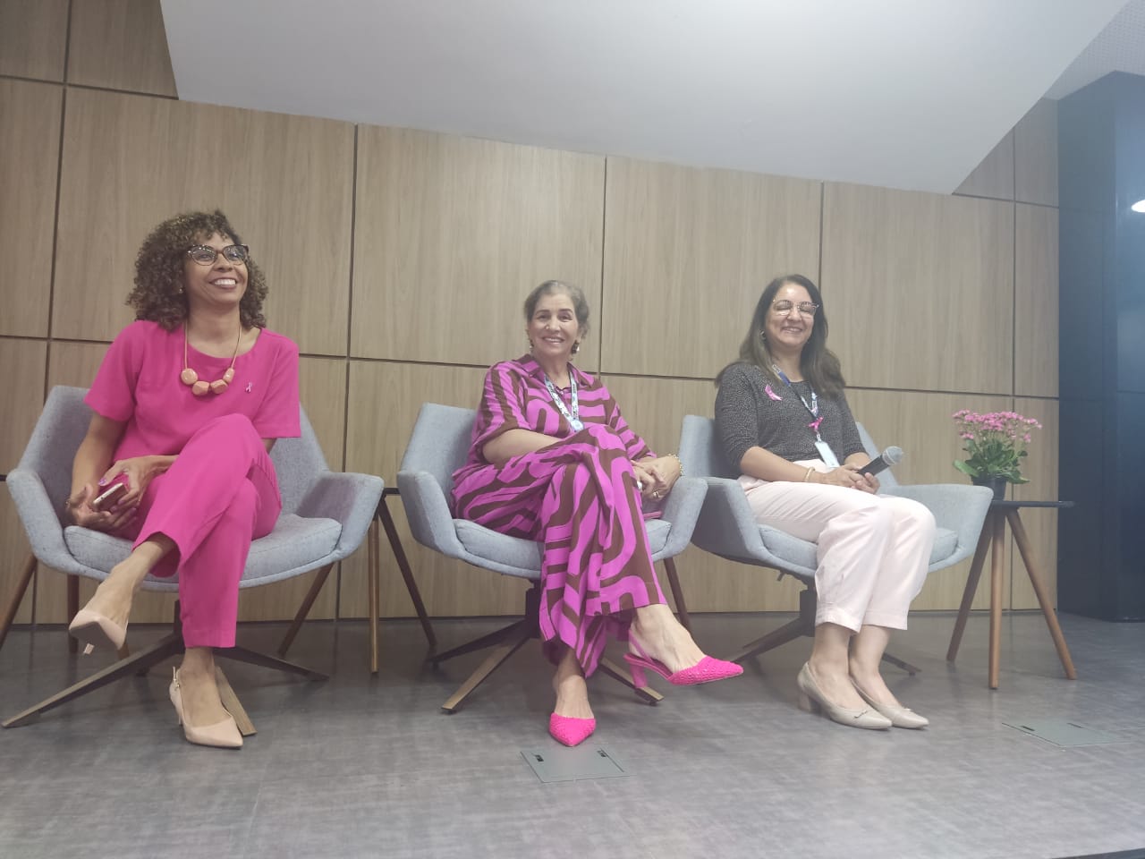 Na ação, que aconteceu no dia 11, a palestrante Jane Gláucia Araújo falou sobre a importância do rastreio do câncer de mama, enquanto Maria Cecilia Fiais Santos ministrou uma apresentação sobre a importância da rede de apoio para a mulher na detecção precoce e tratamento do câncer de mama.