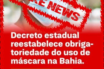 Veiculada em algumas redes sociais desde a última semana, a notícia que o Governo da Bahia teria reestabelecido a obrigatoriedade do uso de máscaras por conta do aumento no número de casos de Covid-19 é FALSA. O último decreto estadual publicado que tratou sobre uso de máscaras na Bahia é de 29 de março deste ano.