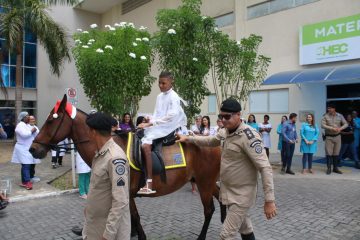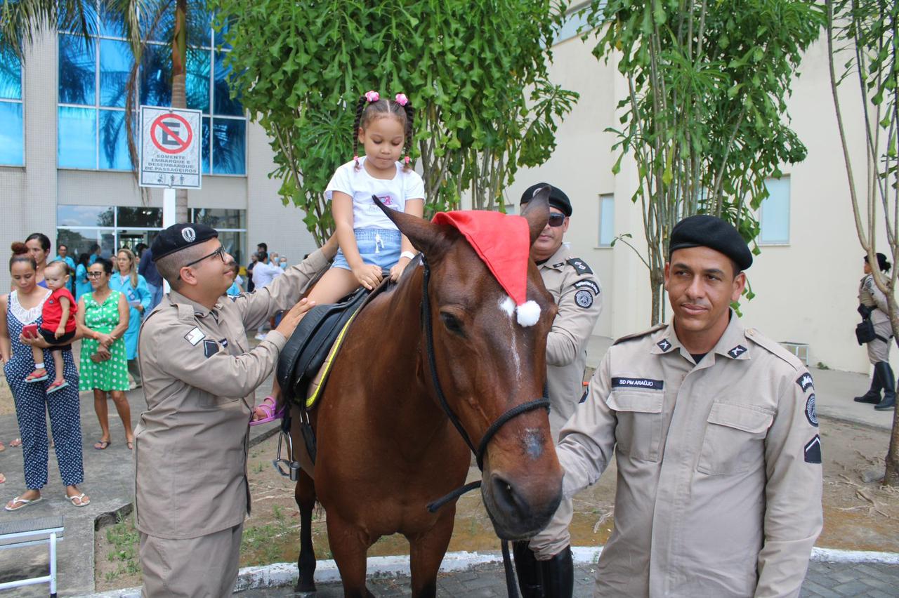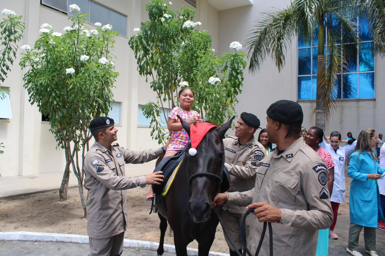 Pacientes do Hospital Estadual da Criança (HEC) participaram, nesta terça-feira (19), do projeto Equino Atividade – “Alegria a Galope”, uma ação do Esquadrão de Polícia Montada de Feira de Santana.