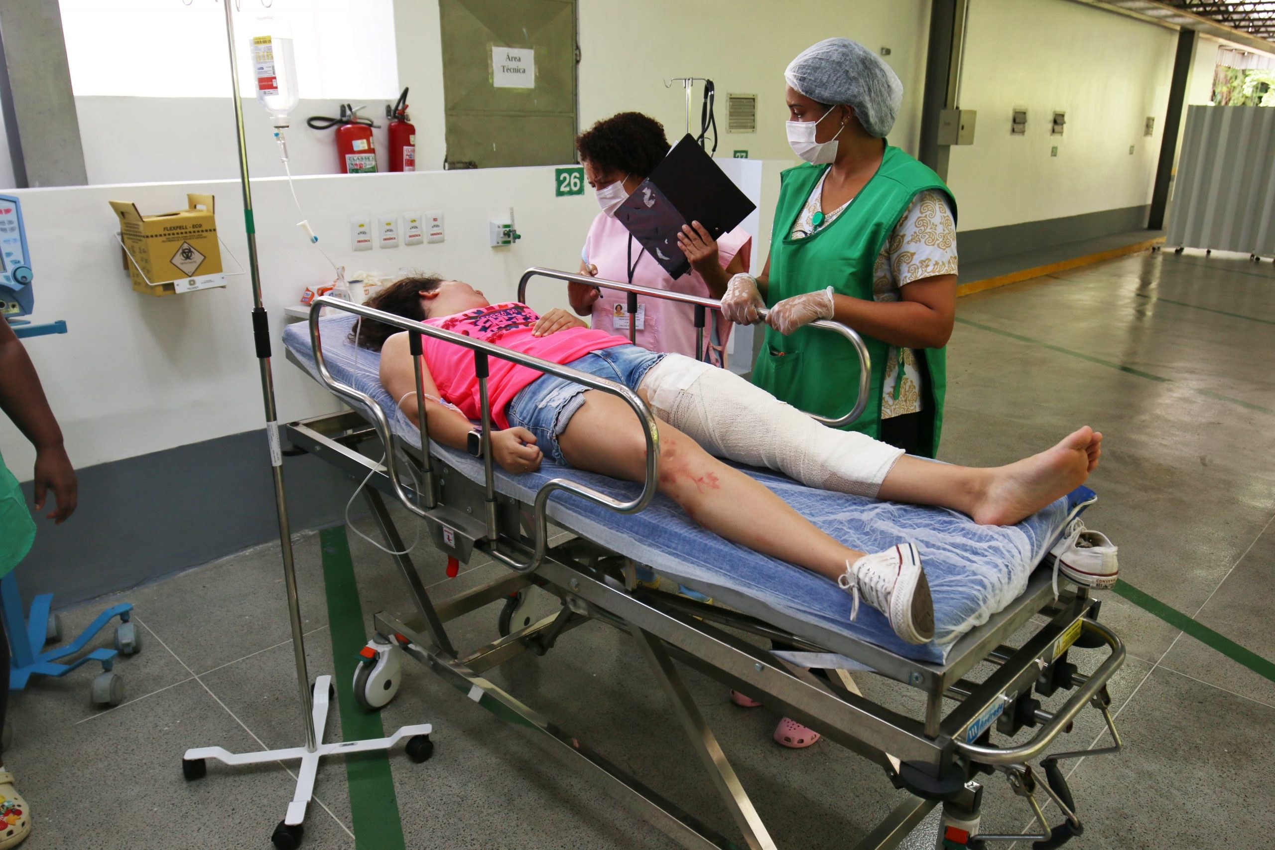 No local da simulação, a presença de viaturas e de agentes socorristas garantem os primeiros atendimentos e o deslocamento célere até a unidade de cuidados hospitalares. Neste caso, foi o Centro de Atendimento a Múltiplas Vítimas do HGE.