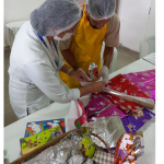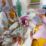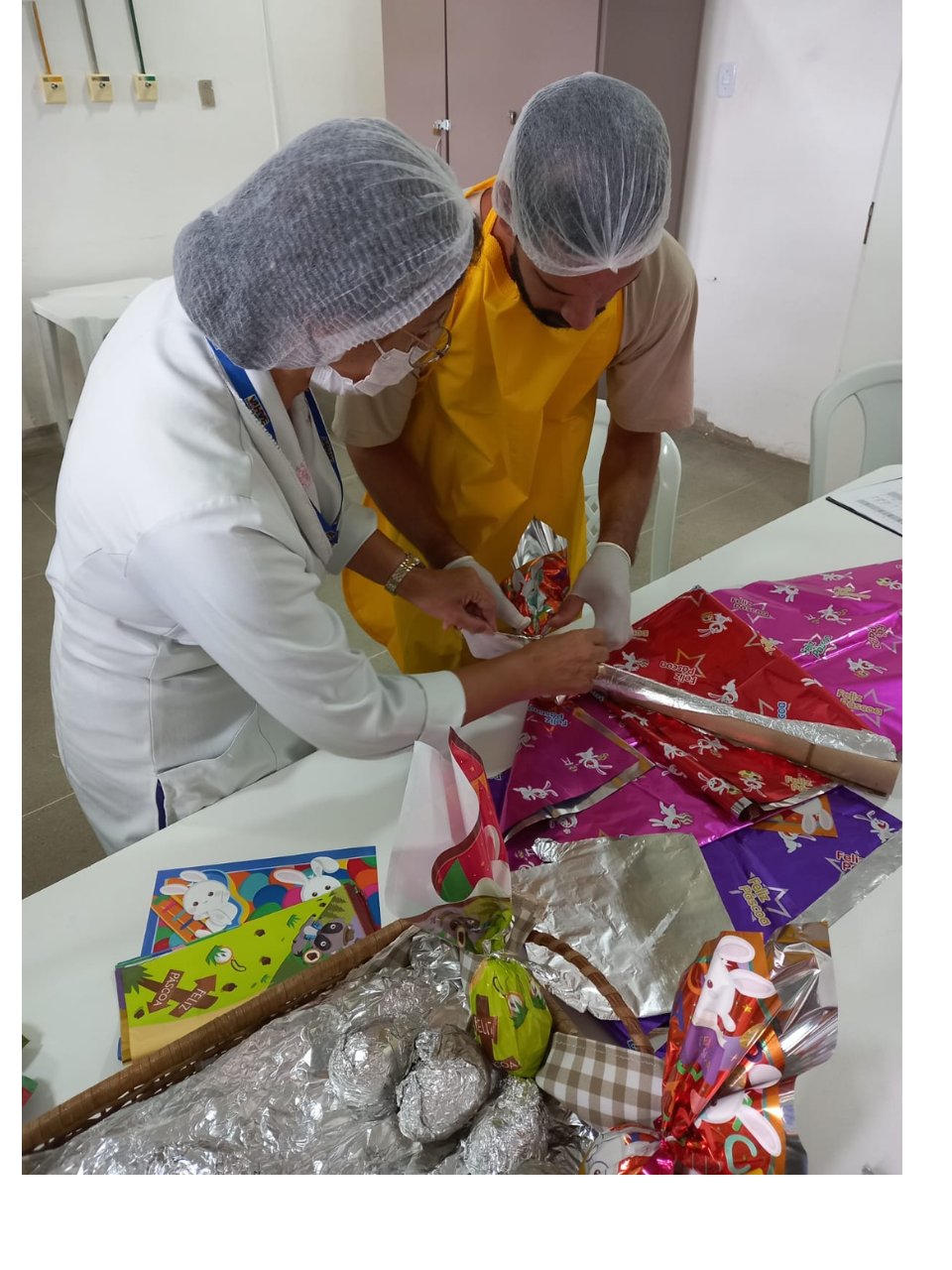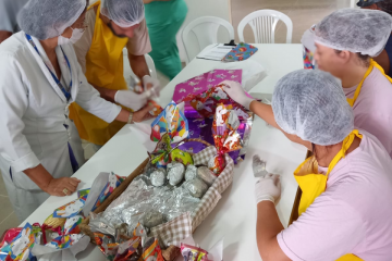 Orientados pela enfermeira Sueli Amaral, da Comissão de Controle de Infecção Hospitalar (CCIH), eles aprenderam a importância do uso de Equipamentos de Proteção Individual (EPI) para a manipulação de alimentos. Após a confecção, cada paciente dedicou-se a embalar os ovos, que serão levados para casa como lembrança da Semana Santa quando receberem alta.