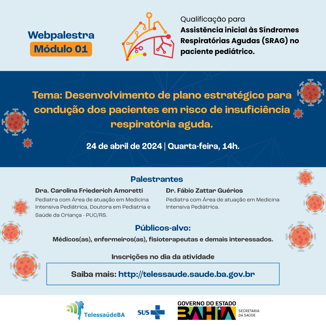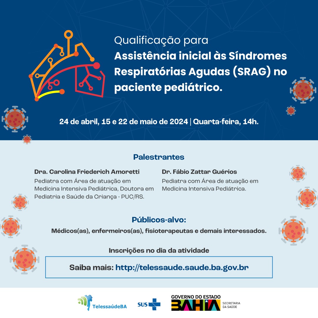 A Secretaria Estadual da Saúde da Bahia (Sesab) promove o curso de “Qualificação para assistência inicial às Síndromes Respiratórias Agudas Graves (SRAG) no paciente pediátrico”. A atividade começa nesta quarta-feira (24) e vai até o dia 22 de maio.