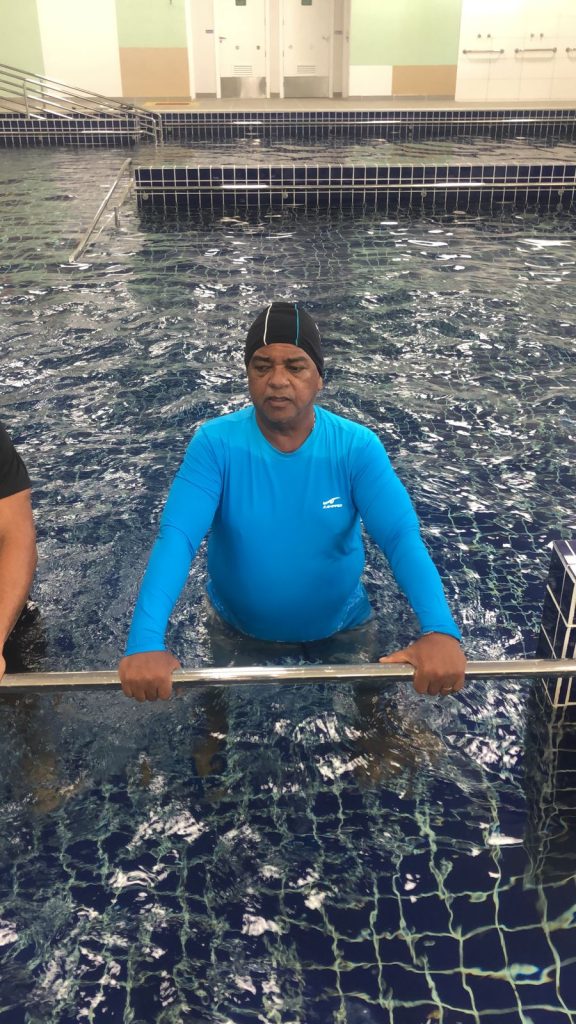 José Raimundo, conhecido como Nenga, é um desses pacientes. Ex-jogador de futebol, já passou por clubes como Ypiranga, Galícia e Vitória, onde foi campeão baiano em 1985. Quando era atleta profissional, fez inúmeras infiltrações de medicamentos nos joelhos machucados para participar das partidas. As dores passavam, mas as lesões só pioraram ao longo do tempo. Hoje, com 61 anos, possui duas próteses, uma em cada joelho. “Segundo o médico, desgastou a cartilagem, os ligamentos e o menisco. Essa piscina está sendo minha salvação”, declara Nenga, que passa por tratamento na unidade três vezes por semana.