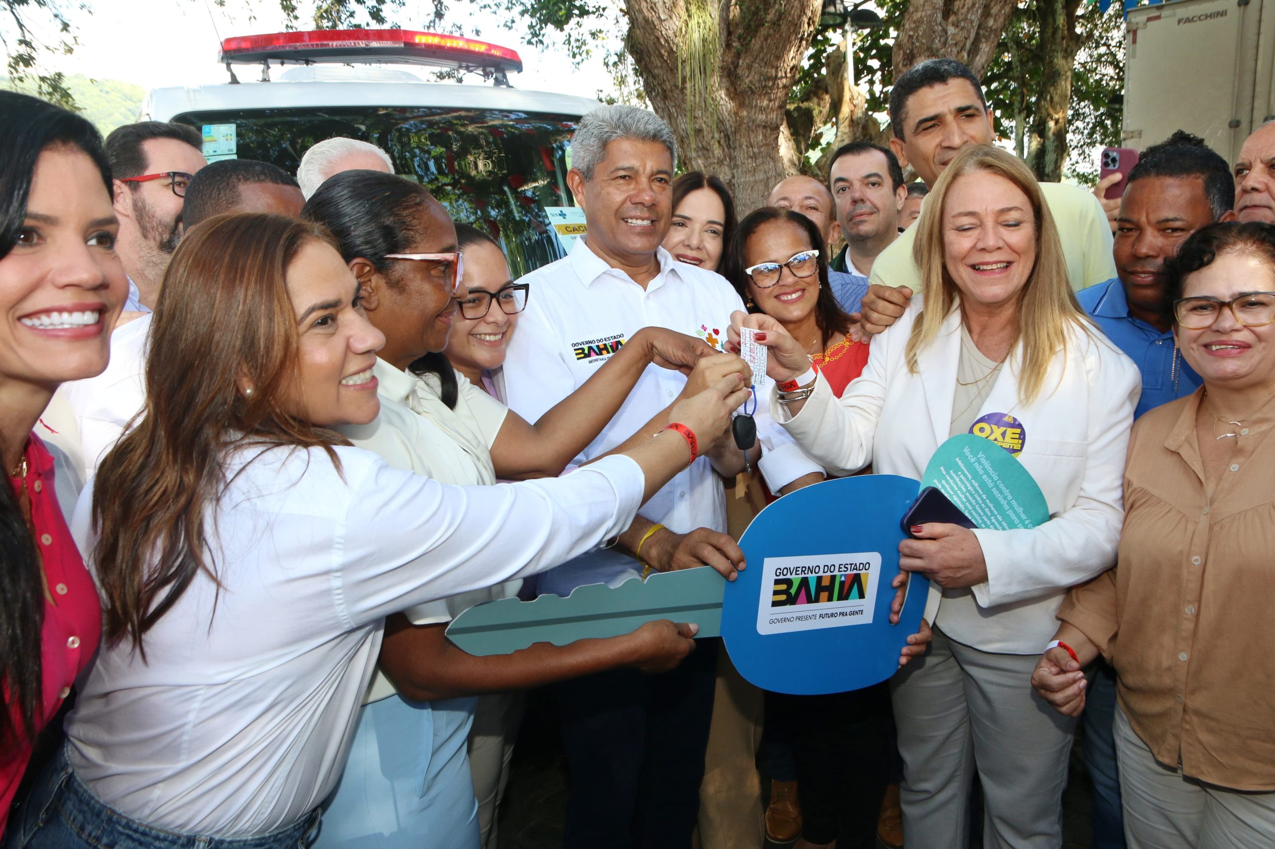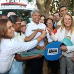 Ainda em Cachoeira, o governador e a secretária entregaram uma nova ambulância para o município, que atenderá as comunidades de Murutuba e Bacia do Iguape, no valor de cerca de 280 mil reais.