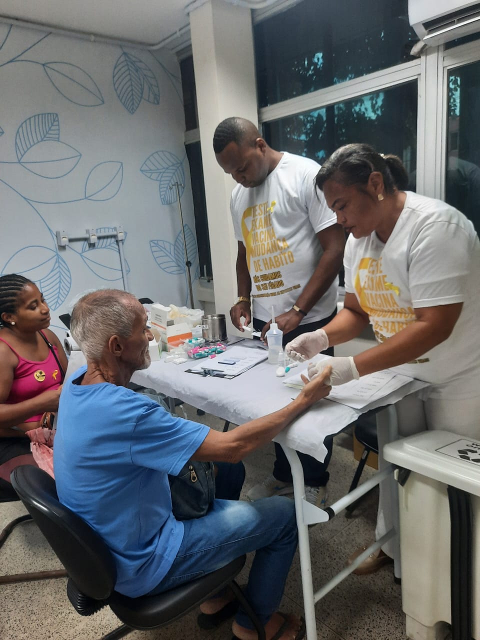 Ornamentada com balões amarelos e em clima festivo, a unidade distribuiu 60 fichas para demandas espontâneas da comunidade, incluindo atendimentos para testagens, exames laboratoriais e consultas. Além disso, foi realizada uma exposição sobre as hepatites para usuários do CAPS Aristides Novis.