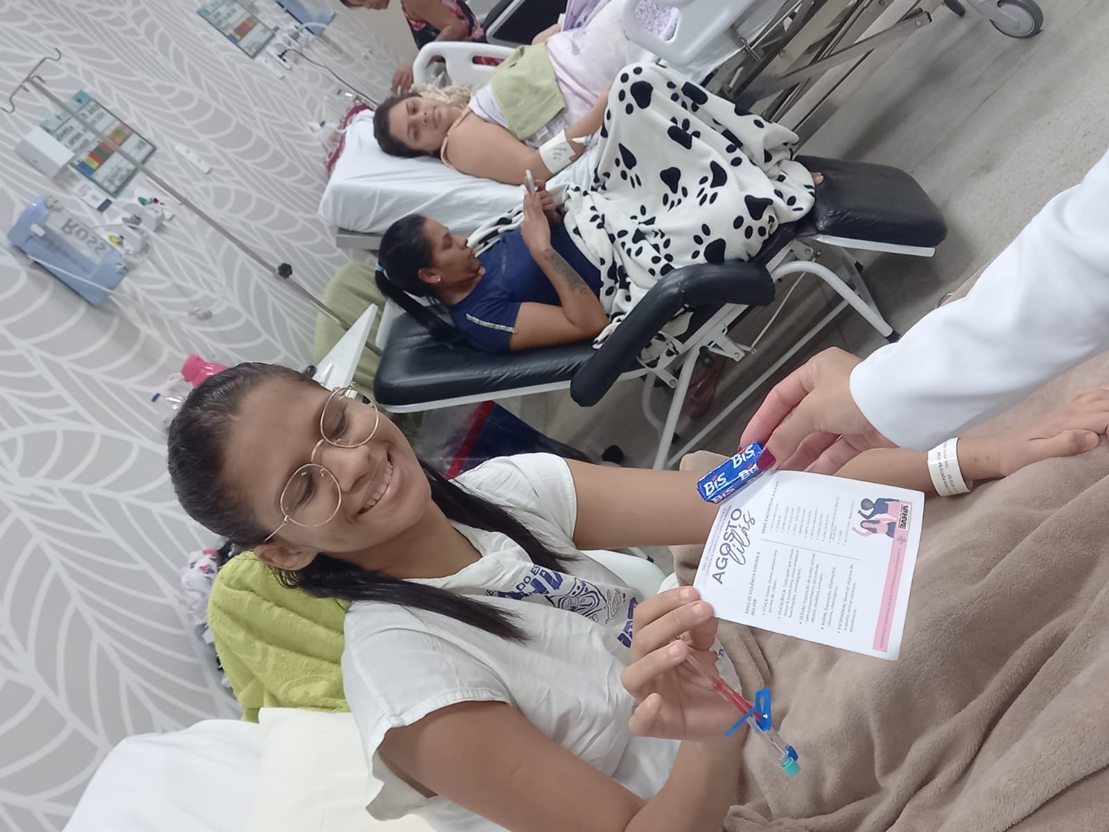 Com o objetivo de informar às pacientes e acompanhantes sobre a violência contra a mulher, durante a ação, foram distribuídas cartilhas que orientam sobre a identificação dos diversos tipos de violência, reforçando a importância do conhecimento e da prevenção. Nas cartilhas continham, também, uma lista de contatos de órgãos da região que atuam na proteção de mulheres e que ofertam auxílio psicológico gratuito.