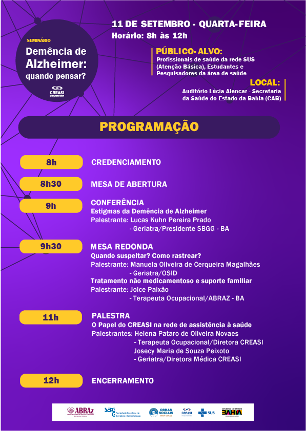 O seminário tem o objetivo de possibilitar reflexões e discussões sobre a Demência de Alzheimer, visando ampliar a capacidade diagnóstica e o escopo das práticas de cuidado em saúde, com foco na Atenção Básica. A programação conta com conferência, palestra, mesa redonda e debate com profissionais das áreas de geriatria e gerontologia, abordando rastreio e diagnóstico, estigmas da doença, tratamento não medicamentoso, suporte familiar e, por fim, o papel do Creasi na rede de assistência à saúde.
