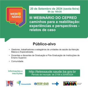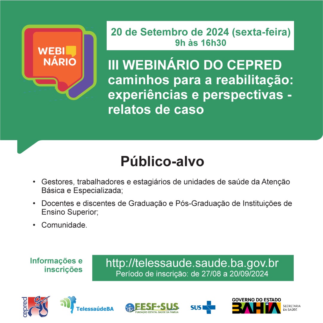 O Centro Estadual de Prevenção e Reabilitação da Pessoa com Deficiência (Cepred) realizou, no dia 20 de setembto, III Webinário, que teve como tema “Caminhos para a Reabilitação – Experiências e Perspectivas: Relatos de Caso”. Realizado anualmente, o evento foi idealizado para fazer parte das comemorações do Dia Nacional de Luta da Pessoa com Deficiência, dia 21 de setembro.