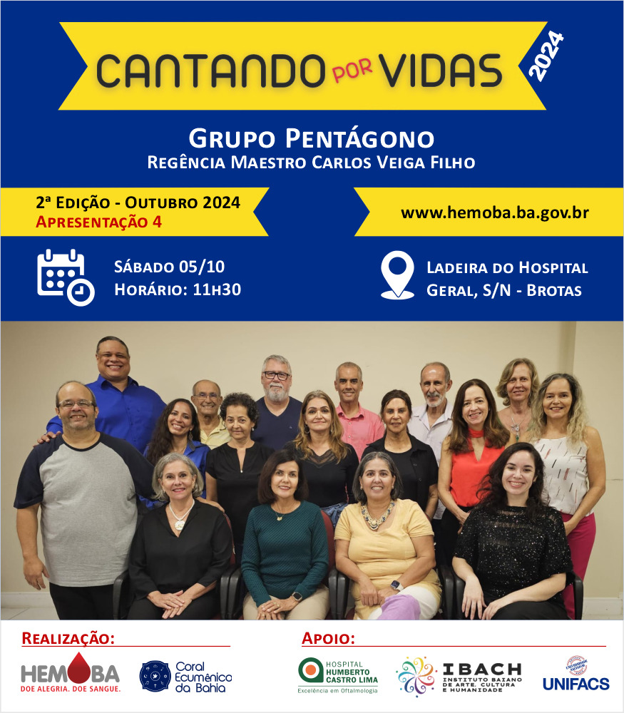 Neste sábado, dia 5 de outubro, a Fundação Hemoba recebe o Grupo Vocal Pentágono, pelo projeto “Cantando por Vidas”, fruto de uma parceria entre a instituição e o Instituto Baiano de Arte, Cultura e Humanidade (IBACH). A ação tem o propósito de promover a conscientização sobre a importância e a necessidade da doação voluntária de sangue. Sob a regência do Maestro Carlos Veiga Filho, a apresentação acontecerá das 11h30 às 12h30, na sede da Fundação, localizada na Avenida Vasco da Gama, em Salvador.