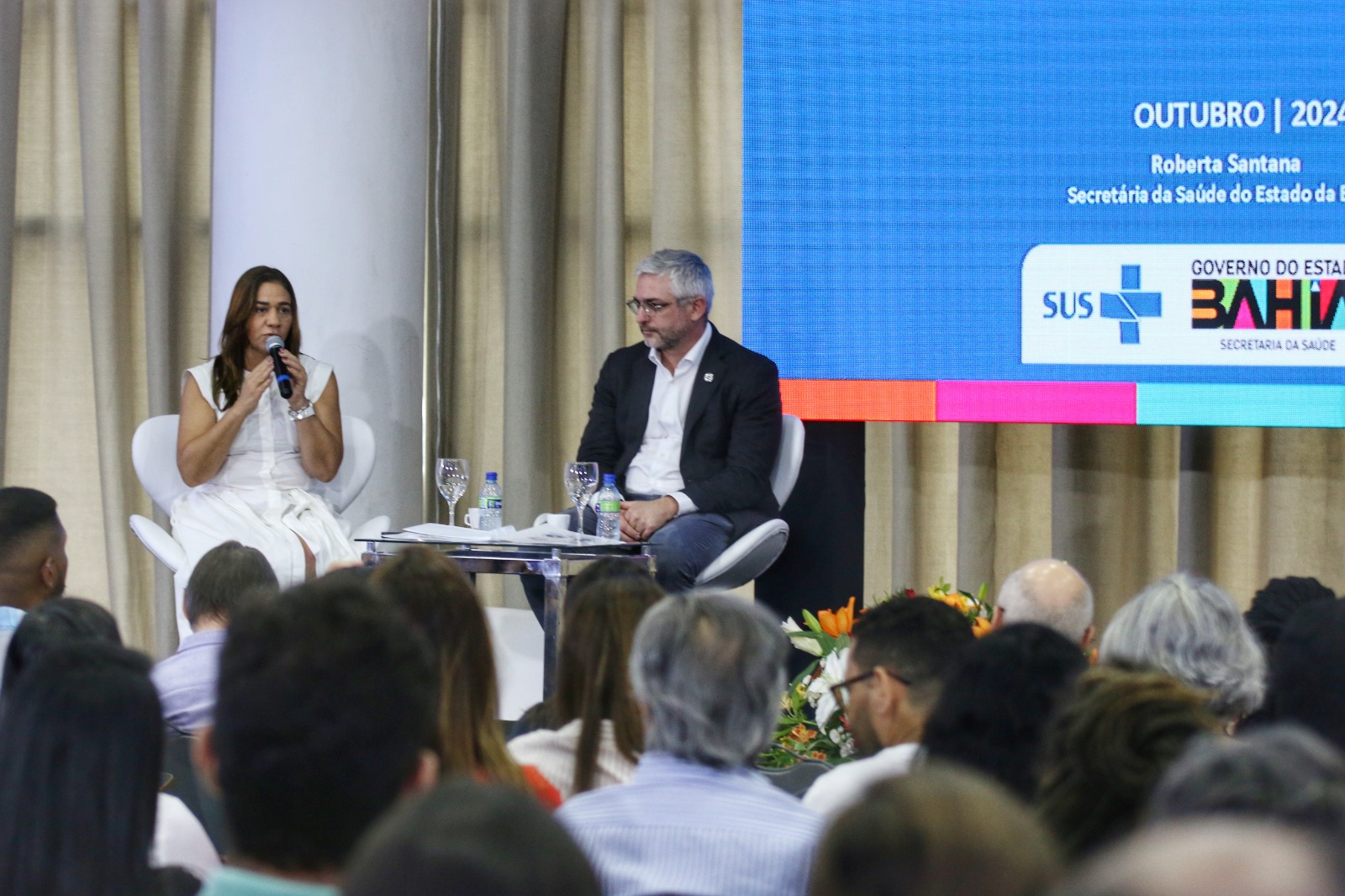 Com a participação a secretária da Saúde do Estado, Roberta Santana, e do secretário de Atenção Especializada (Saes) do Ministério da Saúde, Adriano Massuda, o evento consistiu em uma sessão especial do projeto Saúde Coletiva em Debate, que teve como tema: “Saúde como direito de tod@s: conquistas e desafios no Brasil”. A atividade foi coordenada pela professora Isabela Cardoso Pinto (ISC/UFBA), secretária de Gestão do Trabalho e da Educação na Saúde (SGTES) do Ministério da Saúde.