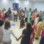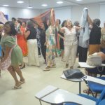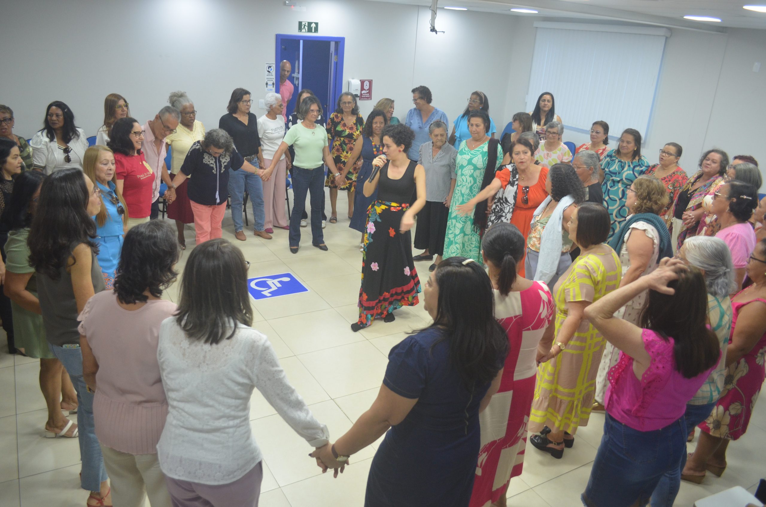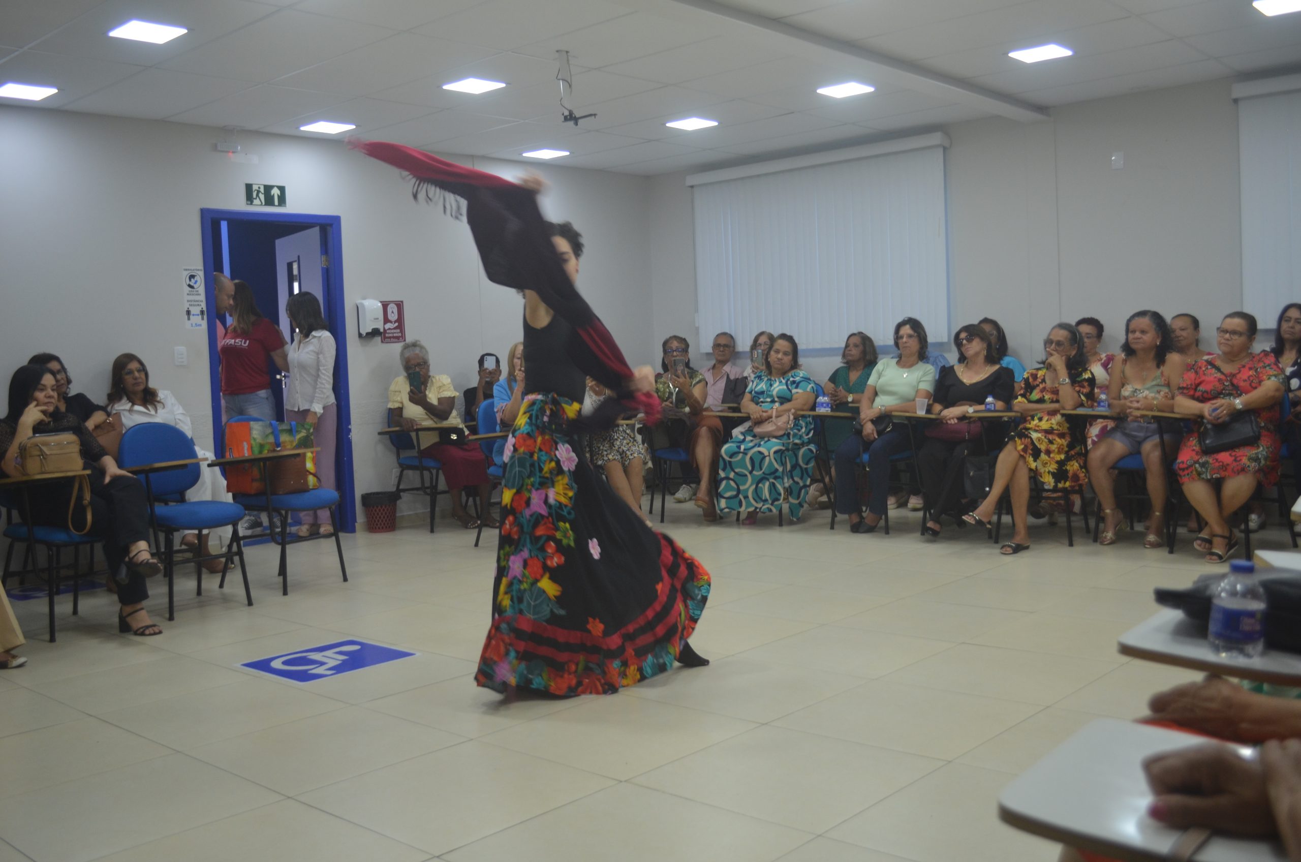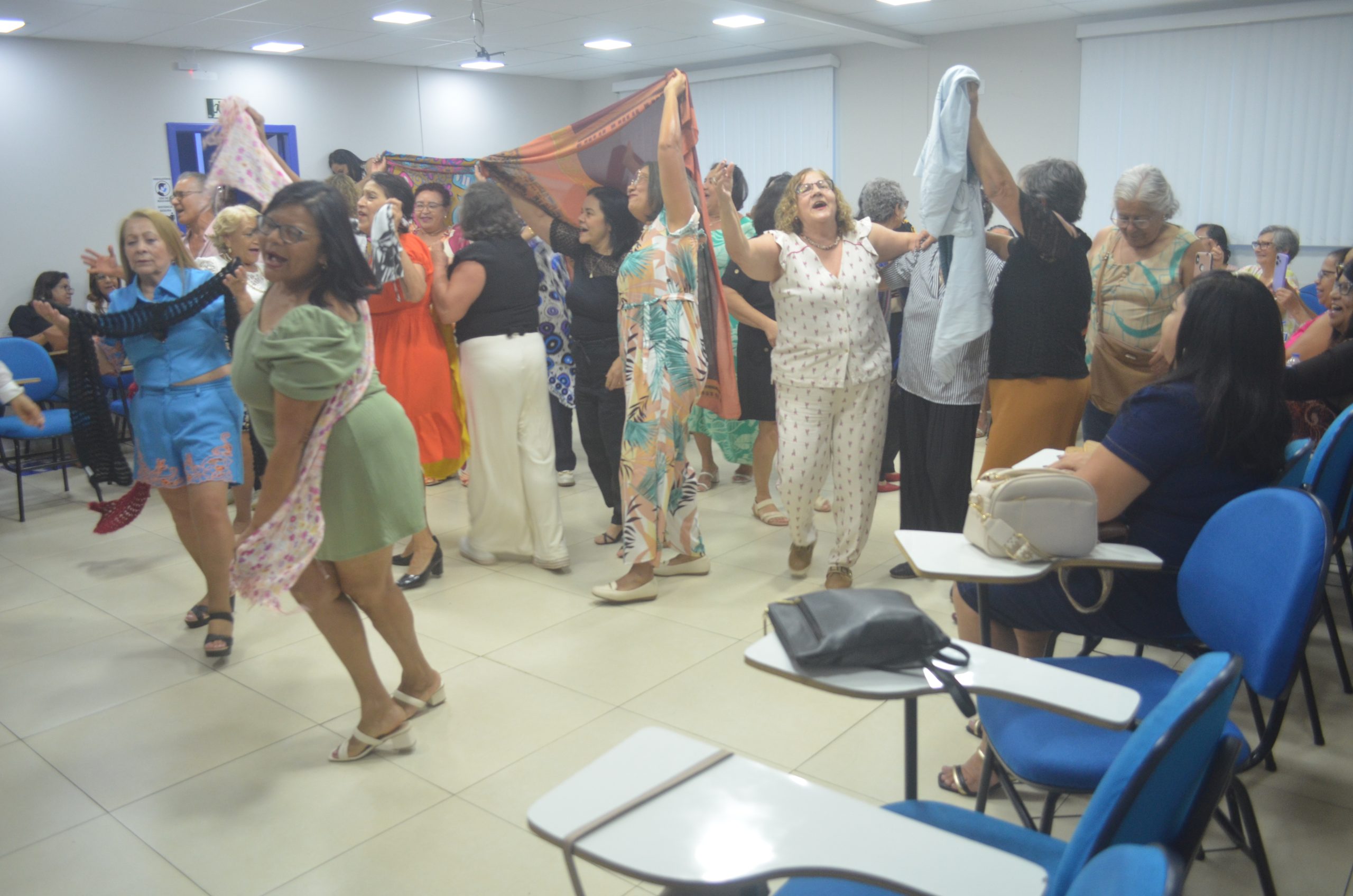 A psicóloga Ana Maria também participou do evento, realizando uma apresentação de dança contemporânea que incluiu dança circular e uma performance com lenços com os aposentados, proporcionando um momento de alegria e relaxamento entre os presentes.