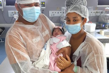 No início da gestação, Adriele foi diagnosticada com diabete e com a glicemia alterando muito, especialmente na última semana antes do parto. Quatro anos atrás, ela teve complicações pós-parto e a primeira filha do casal não resistiu. “Me bateu um desespero vendo que tudo poderia se repetir”, lembra agora. “Foram dias difíceis, eu ficava do lado de fora da UTI, não aguentava ver minha filha naquela situação”, assegura Adriele. “Minha filha é um milagre de Deus e fruto da dedicação desta equipe”, revela o pai com um sorriso no rosto.